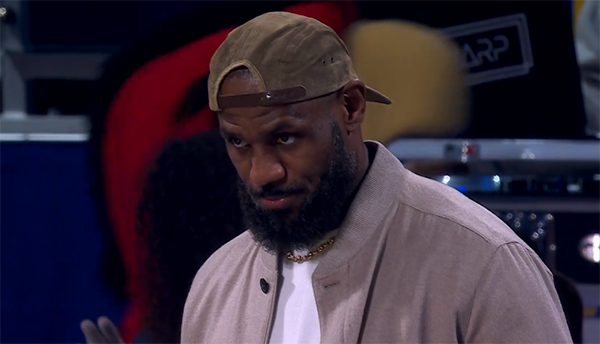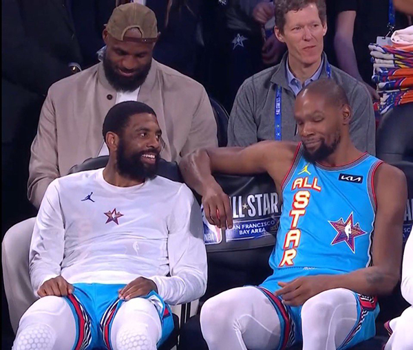 詹姆斯因脚踝和脚部不适而退出全明星正赛,坐在替补席观战,一副詹指导的样子。