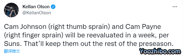 此前太阳在季前赛击败湖人,佩恩和约翰逊都在比赛中遭遇伤病,佩恩仅替补上场1分钟,约翰逊首发上场4分钟;如今他俩的伤情出炉,都因手指扭伤而季前赛报销,所幸他们的伤势都不严重。