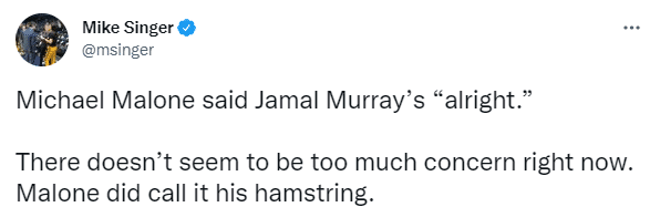 在掘金和公牛季前赛第二节还剩1分多钟,穆雷在防守拉文时不幸受伤,捂着大腿后侧一瘸一拐下场,并且返回更衣室接受检查;随后掘金公布初步检查结果,穆雷左大腿酸痛,退出本场比赛。