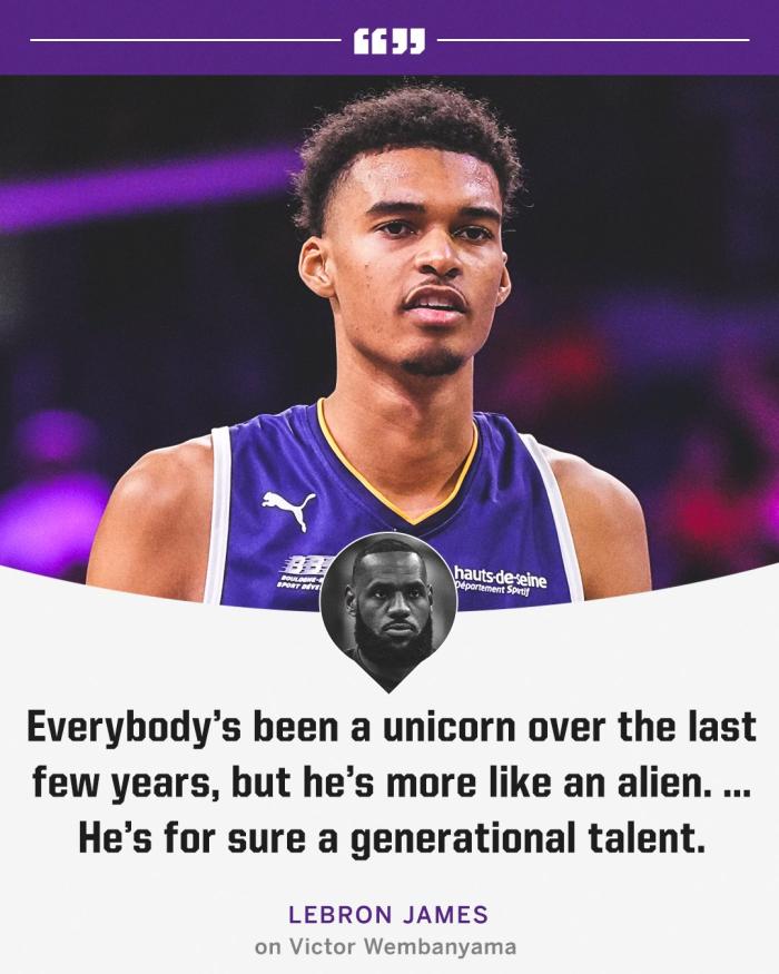 此前詹姆斯曾盛赞文班亚马:从未见过像他这么高的人,仍能在球场上如此流畅与优雅地打球,他是一代天才,很多人给他贴上了独角兽的标签,他更像是外星人。
