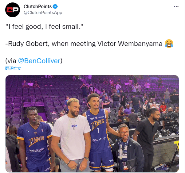 今天森林狼球星戈贝尔与文班亚马合影,戈贝尔表示:他感觉很好,我感觉自己太小了。