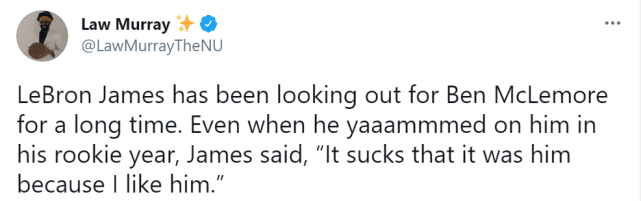 NBA记者Law Murray也写道:“勒布朗-詹姆斯已经关注本-麦克勒莫很久了。甚至当詹姆斯在麦克勒莫的新秀赛季隔扣他时,詹姆斯也说‘是他(被隔扣)这很糟糕,因为我喜欢他。’”