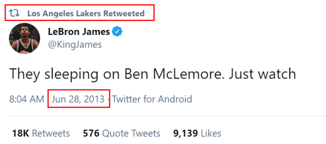有趣的是湖人官网还转发了詹姆斯8年前的一条社媒。当地时间2013年6月28日,詹姆斯发推写道:“他们都在忽视本-麦克勒莫,看着吧。”8年前的詹姆斯就很看好麦克勒莫。