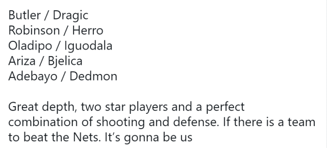 目前热火的整体状态也不错,在一波6连败后已经取得4连胜,排名东部第五。热火球迷认为这套阵容结合了投射和防守,并相信如果有一支球队能击败篮网,那就是他们。你们觉得呢?欢迎留言发表见解。