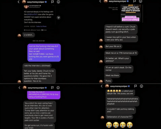 来源:360直播吧04-06 11:25360直播吧讯 前段时间杜兰特最大的新闻就是被联盟罚款5万美元,这件事情的起因是演员迈克尔-拉帕波特(Michael Rapoport)在社交媒体上公开了他和杜兰特之间的聊天记录,其中很明显杜兰特有很多不当的言论,使用侮辱性的词语,其中就包括歧视等等。虽然杜兰特很快就进行了道歉,但据悉迈克尔-拉帕波特没有接受杜兰特的歉意,而且还找到了律师,希望进行维权。后期这件事情以NBA联盟罚款杜兰特5万美元而结束,但对于迈克尔-拉帕波特来说,这件事情并没有这么简单。