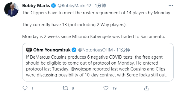 为何快船火速签约考辛斯?据薪资专家Bobby Marks报道,快船需要在本周二填满最少的14人大名单,目前快船队仅有13位球员(不包括双向合同球员);此前快船把卡本盖莱交易到国王;快船签约考辛斯还有一个原因,那就是伊巴卡伤停,快船想用考辛斯填补内线的空缺。