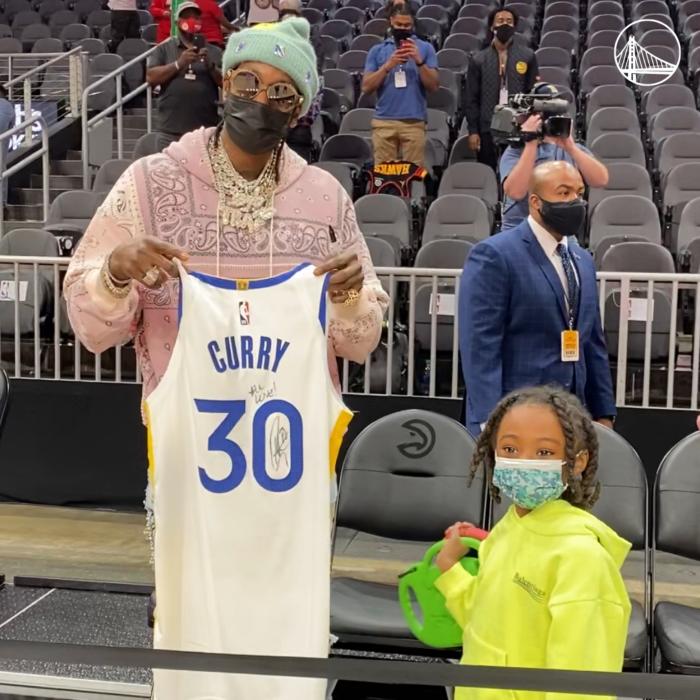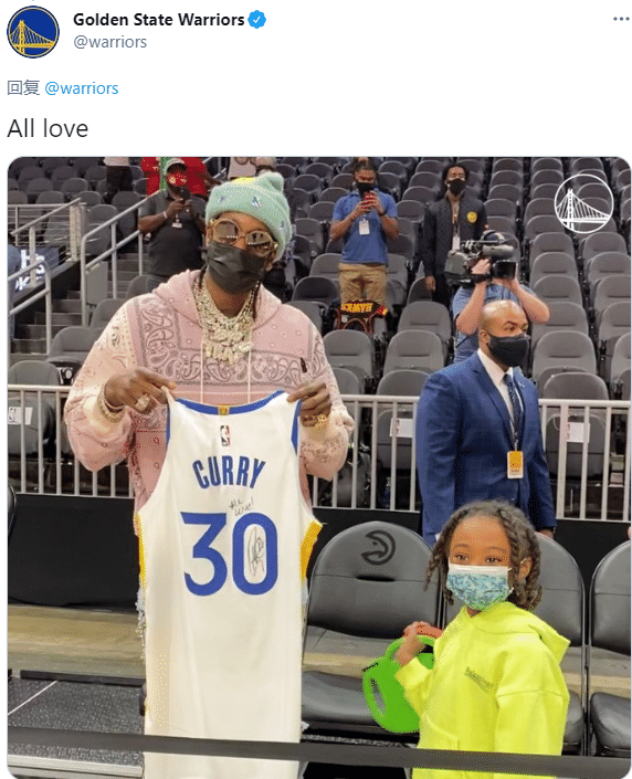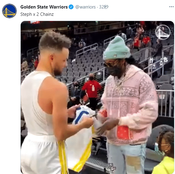 离场前,库里把原味30号球衣送给嘻哈歌手2 Chainz,库里亲笔签名,穿着白色小背心返回更衣室;勇士官方晒出这一幕,并且写道:满满的爱。