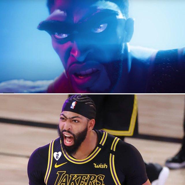 除了詹姆斯自己,利拉德、克莱-汤普森、浓眉、WNBA明星陶乐西也都在预告片中出现。詹姆斯的卡通形象(下图),还蛮有特色,他在进入卡通世界后的变身场景也很有趣,掉进沙漠溅起的沙子都是篮筐的造型。