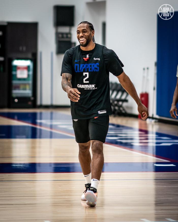 从所穿训练服的配色来看,朗多应该是和小卡、乔治分在一队,训练中小卡咧嘴大笑,露出一嘴大白牙,心情特别好。