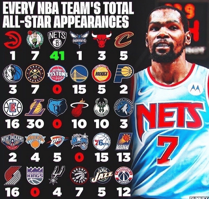 各队球员入选全明星总和!篮网傲视群雄,湖人次席,4队为0