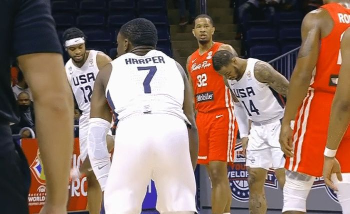 今天的比赛美国队首发阵容:大卫-斯托克顿、加洛韦、乔-约翰逊、布莱恩-鲍文、布莱克,首节的比赛开始后美国队发挥得并不好,进攻端慢热,波多黎各队取得了7:2的开局,布莱克篮下强打得分,大卫-斯托克顿三分也有,美国队追平了比分,两队进入拉锯战,比分交替领先,罗梅罗反击强打命中并且造成了乔丹-贝尔犯规,莫吉察三分命中,波多黎各再次取得了比分上的领先,布朗尼突破上篮再中,弗里曼空切上篮命中帮助美国队打破得分荒,摩根三分投射也中,奥蒂兹上篮命中回应,波多黎各保持着5分左右的领先优势,首节比赛打完,美国队落后7分。