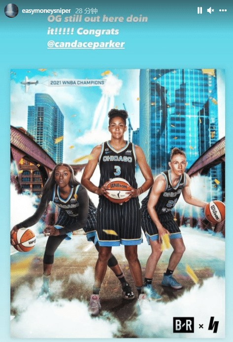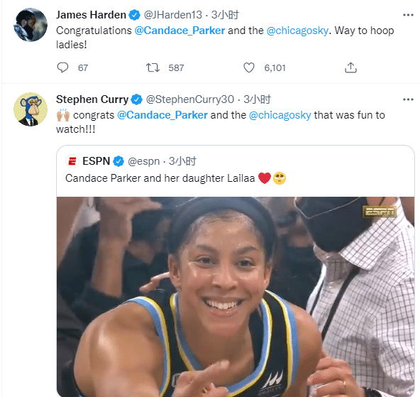 杜兰特恭喜帕克夺冠,老将仍旧能够做到这一切;库里转发帕克夺冠后示意女儿过来的庆祝画面,配文写道:恭喜坎迪斯-帕克和芝加哥天空队!比赛太精彩了!