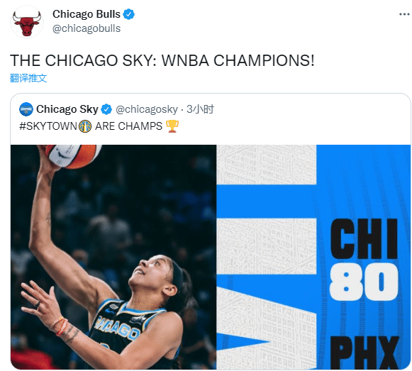 NBA球队芝加哥公牛第一时间转发天空队夺冠海报,恭喜她们赢得WNBA总冠军!