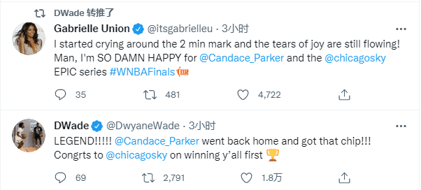 韦德爱妻尤尼恩发推写道:大概2分钟后我开始哭泣,喜悦的泪水还在流!我太高兴了,史诗级的系列赛。我是唯一一个超级情绪化的人吗?我忍不住哭了,但这就是为什么我是一个超级粉丝。喜欢这个比赛!