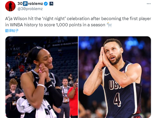 阿贾-威尔逊用一记潇洒的中投创造里程碑之夜,得分破千后她怒吼疯狂庆祝,暂停期间,阿贾与队友一起庆祝,球迷为她高呼MVP,阿贾向球迷比心示爱,她还模仿库里做出晚安安的庆祝动作。