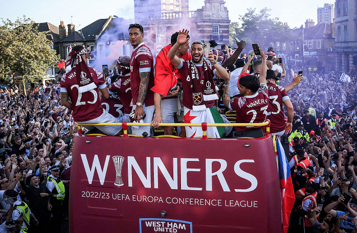 球员们坐在冠军大巴车上庆祝,大部分的球员都戴着西汉姆联的帽子,也有球员将毛巾系在头上,戴着金牌、捧着冠军奖杯,与来到现场的球迷们一起欢呼庆祝。他们在欧协杯取得了重大的突破,本赛季注定是成功的。