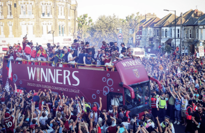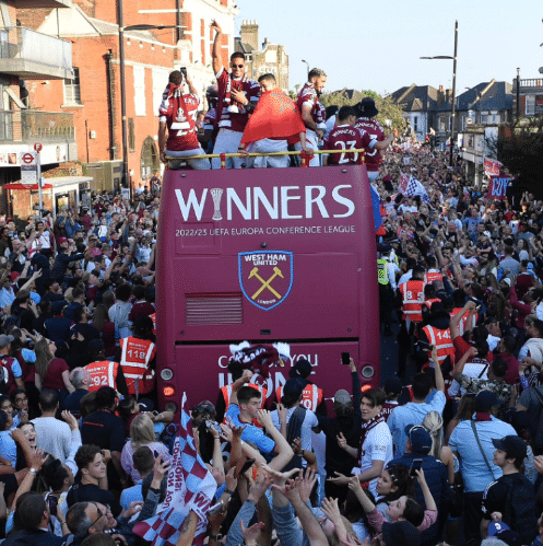 西汉姆联的夺冠游行声势浩大,超过7万球迷走上街头,参加球队的冠军游行,导致东伦敦交通瘫痪。43年没有赢得过大赛冠军、58年来没有斩获过欧战冠军,如今这一切都被一座欧协杯冠军清零。夺冠仪式上,西汉姆联的主帅莫耶斯高举冠军奖杯,非常激动。