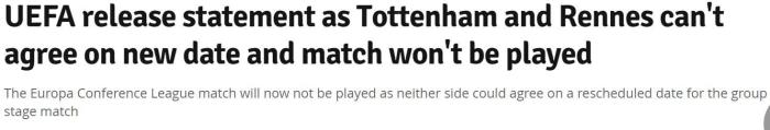 欧足联官方表示,欧足联与热刺、雷恩商议,试图找到一个可行的办法来解决这个问题。但是本次协商没有找到一个可行的办法,因此这场比赛将不会进行。