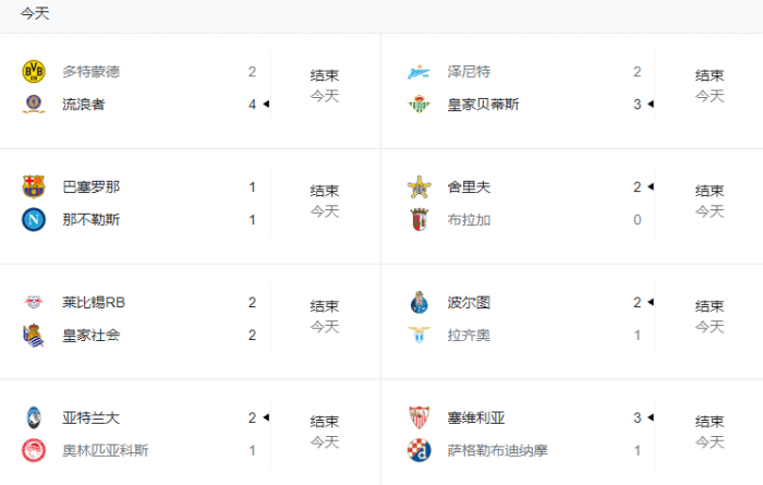 360直播吧02月18日讯 今天凌晨,巴萨在欧联淘汰赛附加赛主场1-1战平那不勒斯,同时进行的还有其他几场附加赛,以下为具体战况。