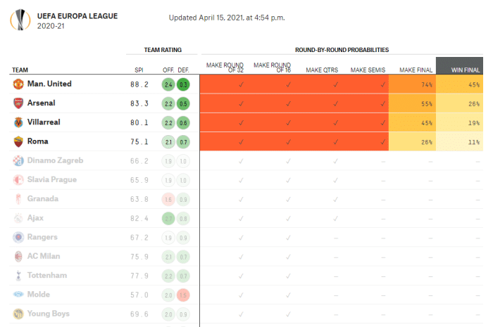 来源:360直播吧04-16 16:33360直播吧4月16日讯 欧联杯四强出炉了,曼联、罗马、比利亚雷亚尔和阿森纳进入了欧联杯四强,而其中曼联将要对阵罗马,比利亚雷亚尔要对阵阿森纳,首回合的比赛在当地时间4月29日举行,次回合的比赛在当地时间5月6日举行(北京时间都要晚一天)。而其中,曼联和比利亚雷亚尔都是先主后客。而大数据网站“538”也更新了本赛季欧联杯夺冠的几率,其中曼联是最大的热门。