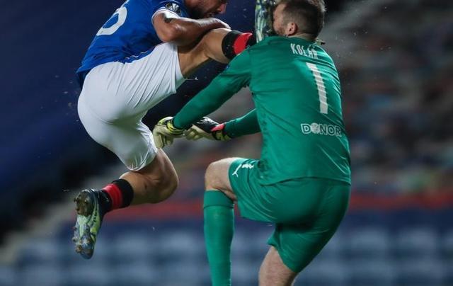 360直播吧3月19日讯 今天凌晨,格拉斯格流浪者在欧联杯八分之一决赛次回合比赛中0-2不敌布拉格斯拉维亚,流浪者在比赛期间被罚下两人,其中前锋鲁夫因为亮鞋钉飞踹对方门将的脸被罚下场。