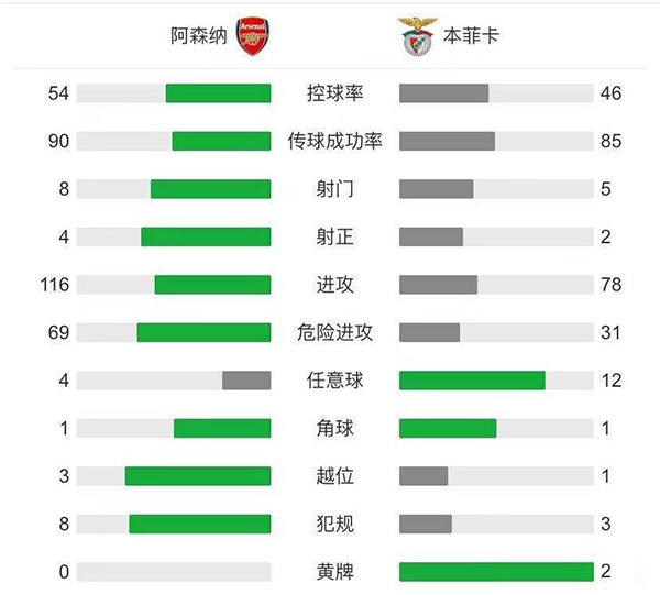 第42分钟,本菲卡获得前场中路偏左的任意球机会,贡萨尔维斯直接打门轰出一记世界波直挂球门死角,本菲卡1-1阿森纳。