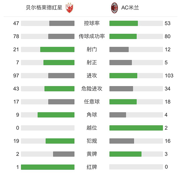 全场比赛结束,AC米兰2-2贝尔格莱德红星。