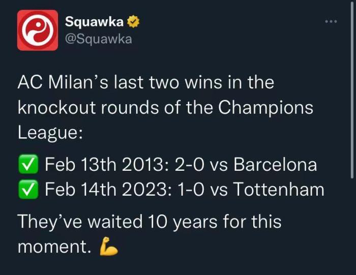 360直播吧02月15日赛后据squawka统计,AC米兰上一次在欧冠联赛淘汰赛赢球还要追溯到2013年2月13日。
