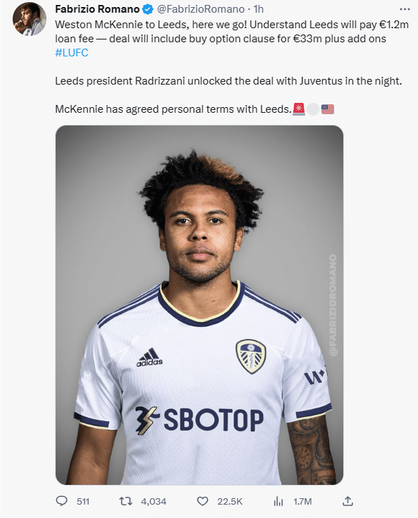 罗马诺:利兹联租借尤文球员韦斯顿·麦肯尼