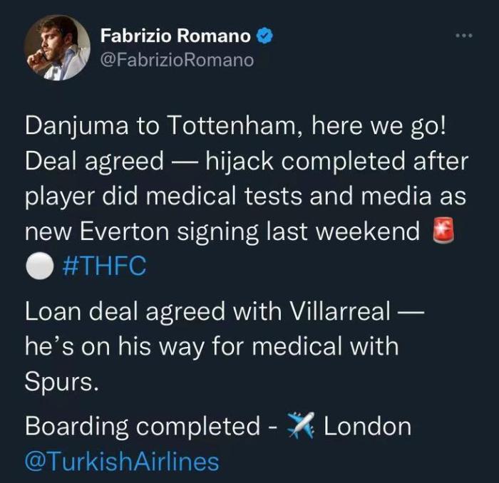 罗马诺表示,herewego!丹朱马将加盟托特纳姆热刺,协议达成。在上周末埃弗顿和丹朱马达成协议并完成体检后,热刺完成了截胡。