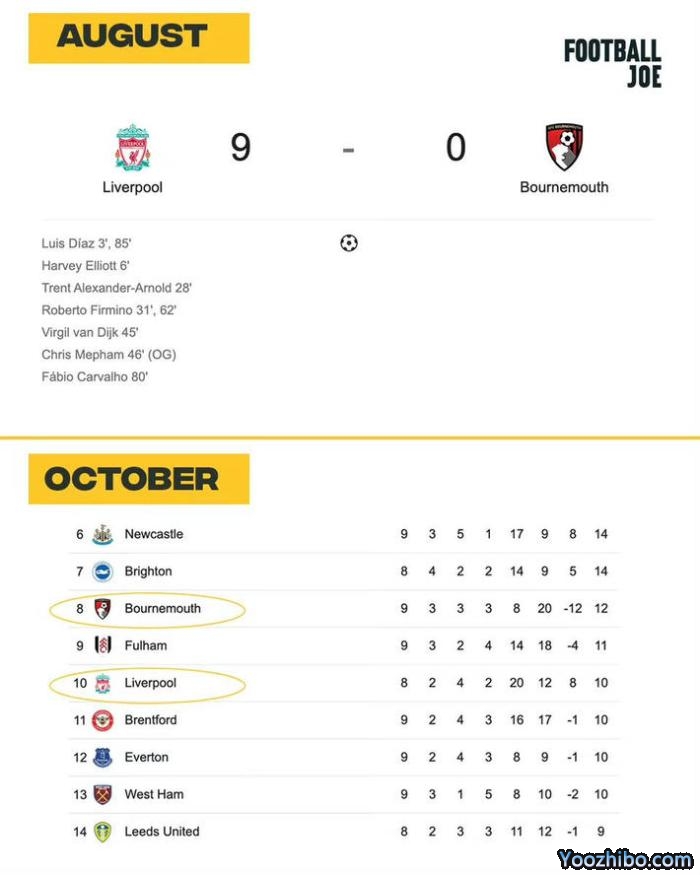 8月份伯恩茅斯曾被利物浦9-0横扫,至今净胜球还是-12个,但惨败后他们在联赛中2胜3平,积分也超过了利物浦。