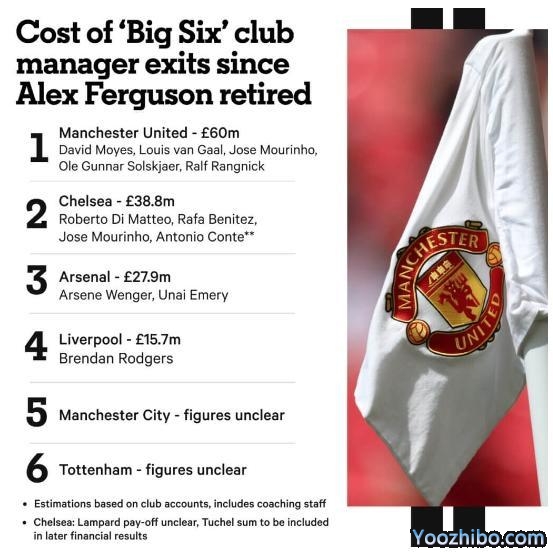 360直播吧10月09日据TheAthletic统计,自从弗格森退休之后,曼联是英超解雇主教练花费最多钱的俱乐部。