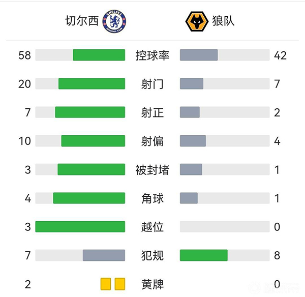上半场补时阶段,芒特右路传中,哈弗茨头球吊射破门,切尔西1-0领先狼队。