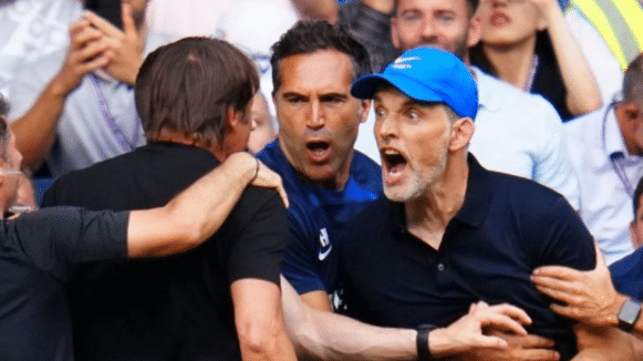 除了裁判引起巨大争议之外,场边图赫尔和孔蒂也多次冲突,其中就包括下半场哈弗茨倒地,霍伊别尔破门,图赫尔对于此前哈弗茨倒地未判非常愤怒,场边图赫尔和孔蒂对喷,双方的教练团队包括球员都上来拉架。