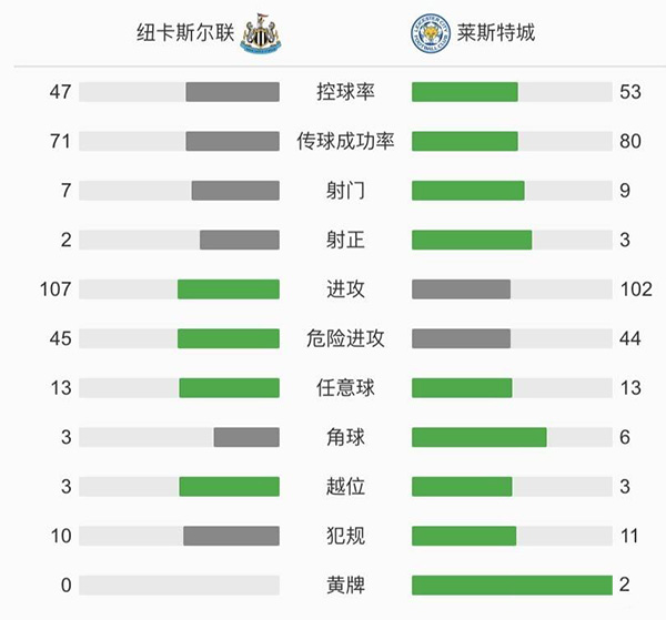 莱斯特城2-1纽卡斯尔 麦迪逊抽射卡罗尔替补破门