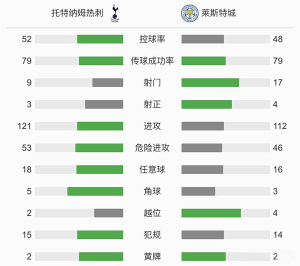 主队托特纳姆热刺方面,凯恩获得全队最高的6.9分;客队莱斯特城方面,瓦尔迪获得全场最高的8.1分。